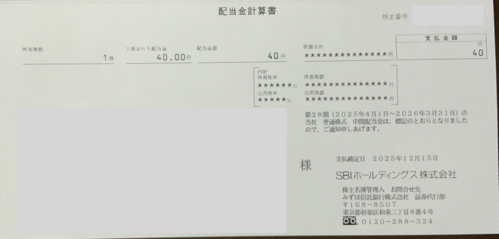 AOKIは1株20円、SBIホールディングスは1株40円でしたが、夫の初めての配当金は1株80円でした。