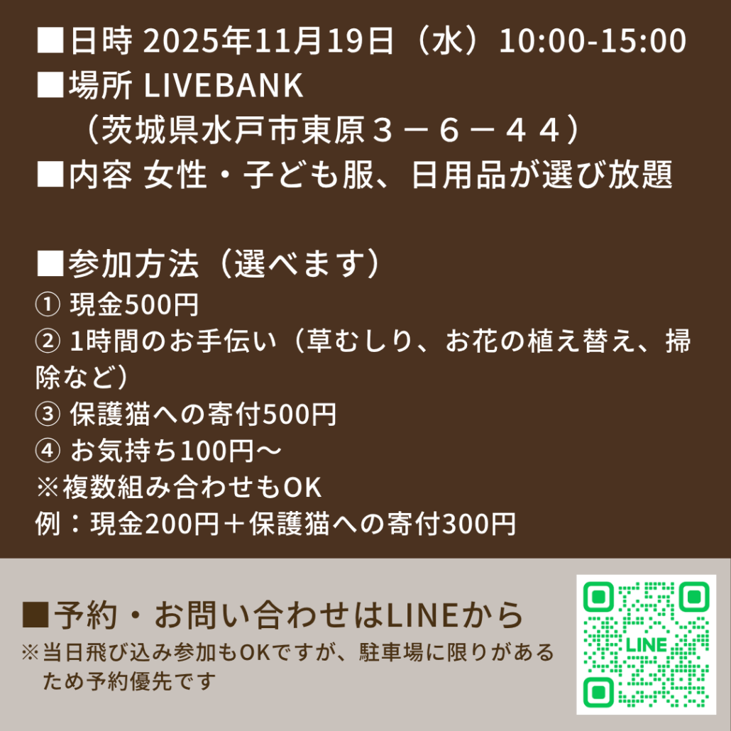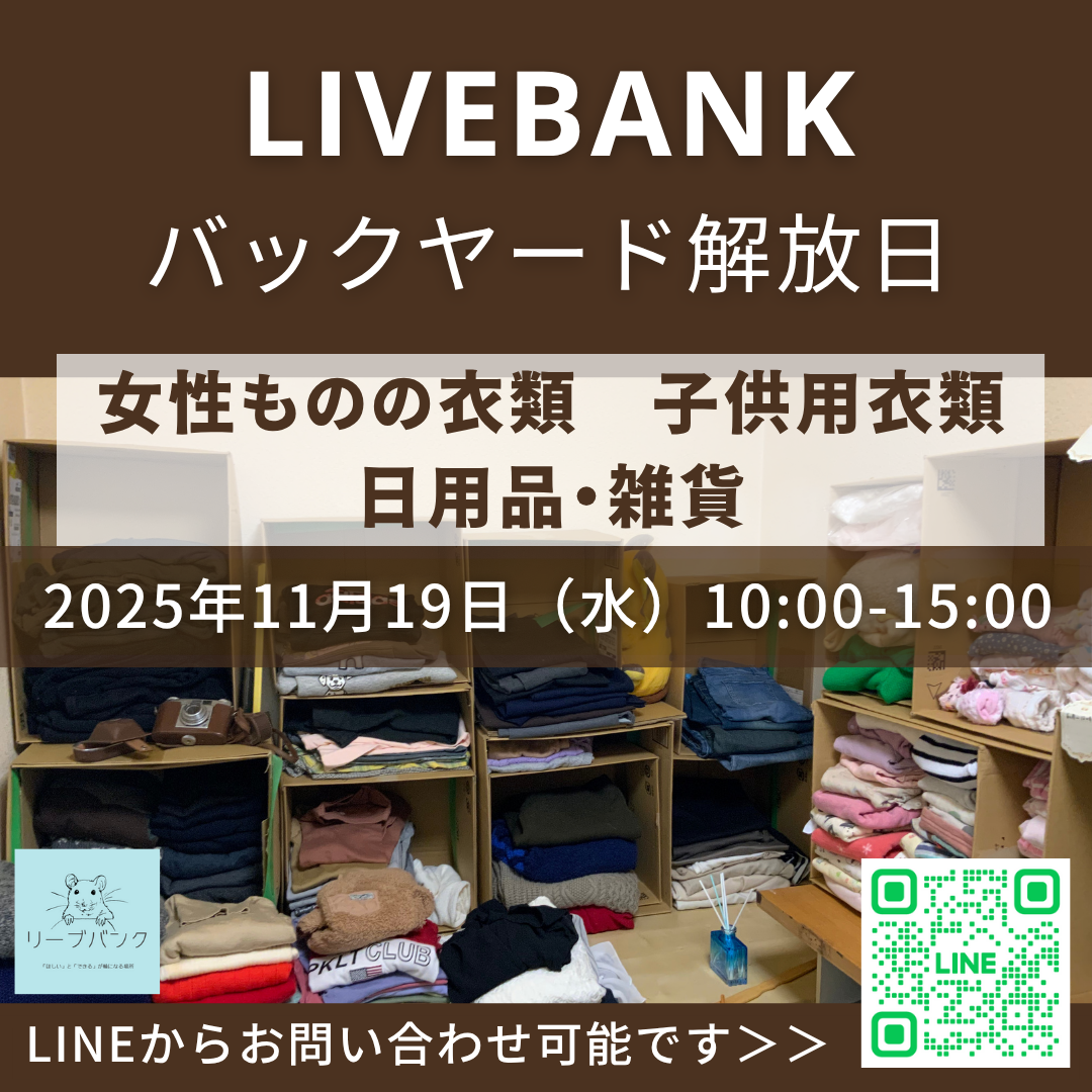 livebankにて、バックヤードに保管している女性ものの衣類、子ども用衣類、日用品・雑貨を大放出します!